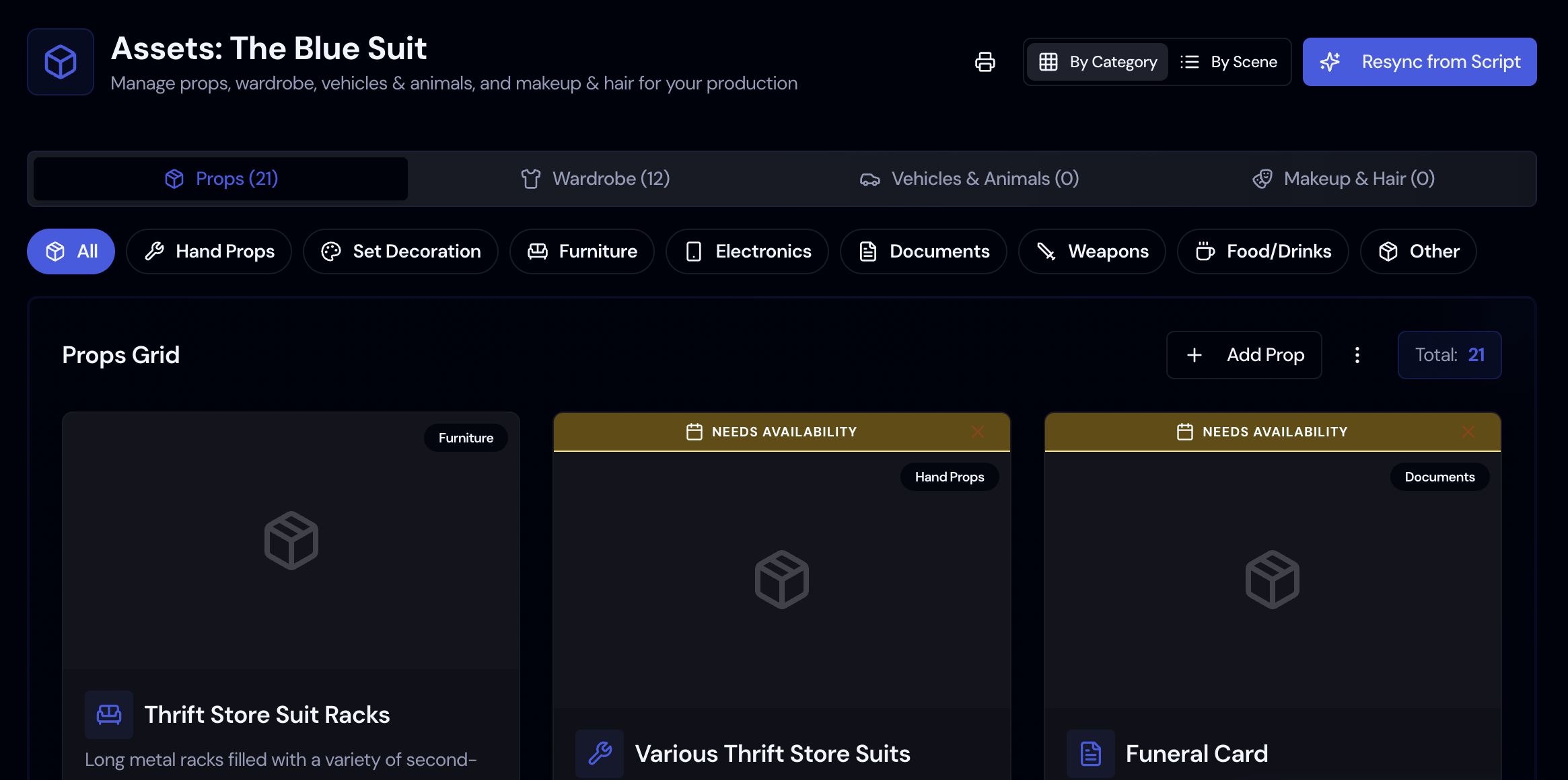 Keep track of every costume piece and prop needed for your production. Organize by scene, character, and department.
