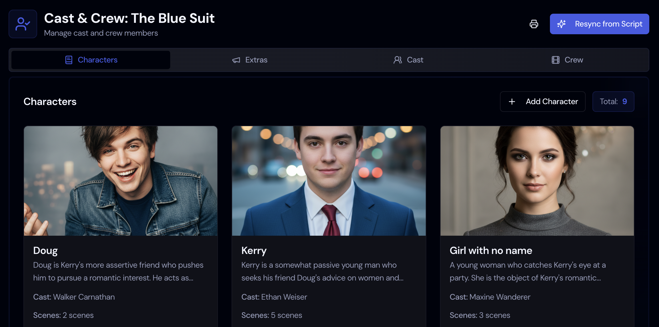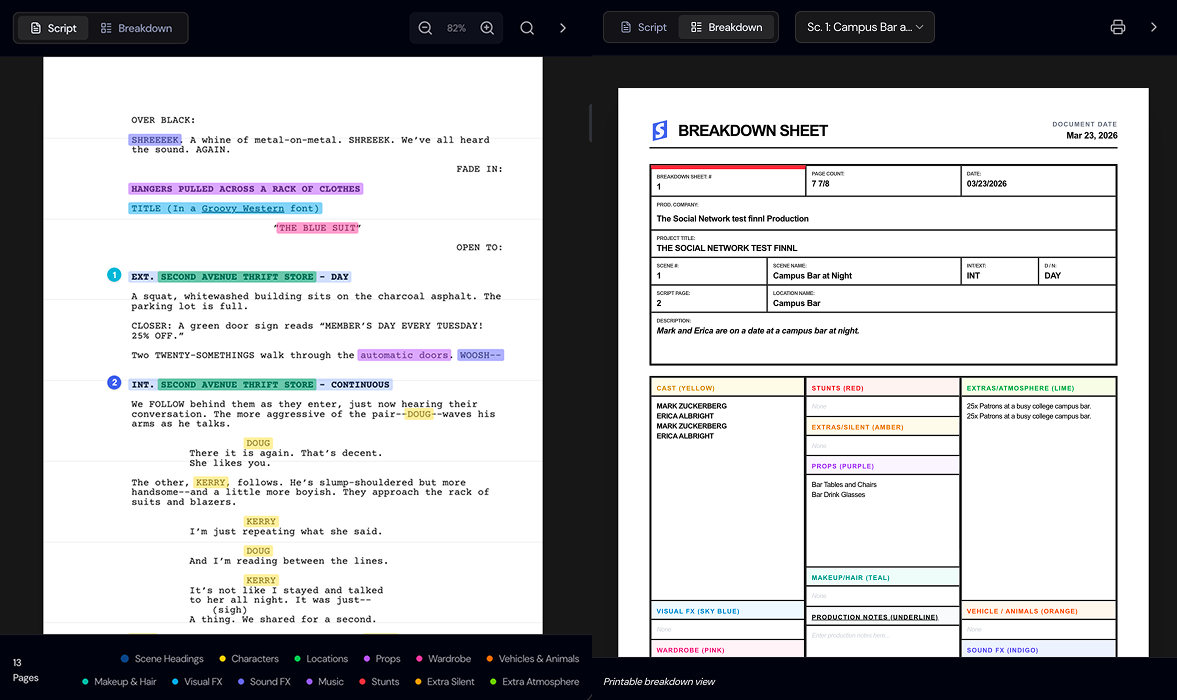 Storiara instantly analyzes your script to pull all key production elements. In seconds, you can extract characters, scenes, locations, props, and wardrobe directly from your screenplay, transforming weeks of manual breakdown work into an automated workflow.